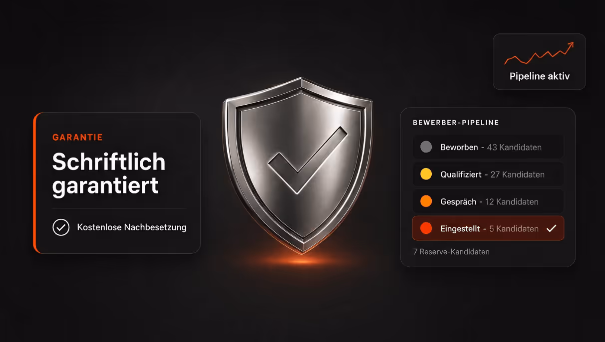 Wir garantieren Dir die Einstellung passender Fachkräfte innerhalb von 30 Tagen. Dafür übernehmen wir die Verantwortung – vertraglich festgehalten. Die Garantie gibt Dir volle Sicherheit, dass Deine Investition zu den vereinbarten Ergebnissen führt.